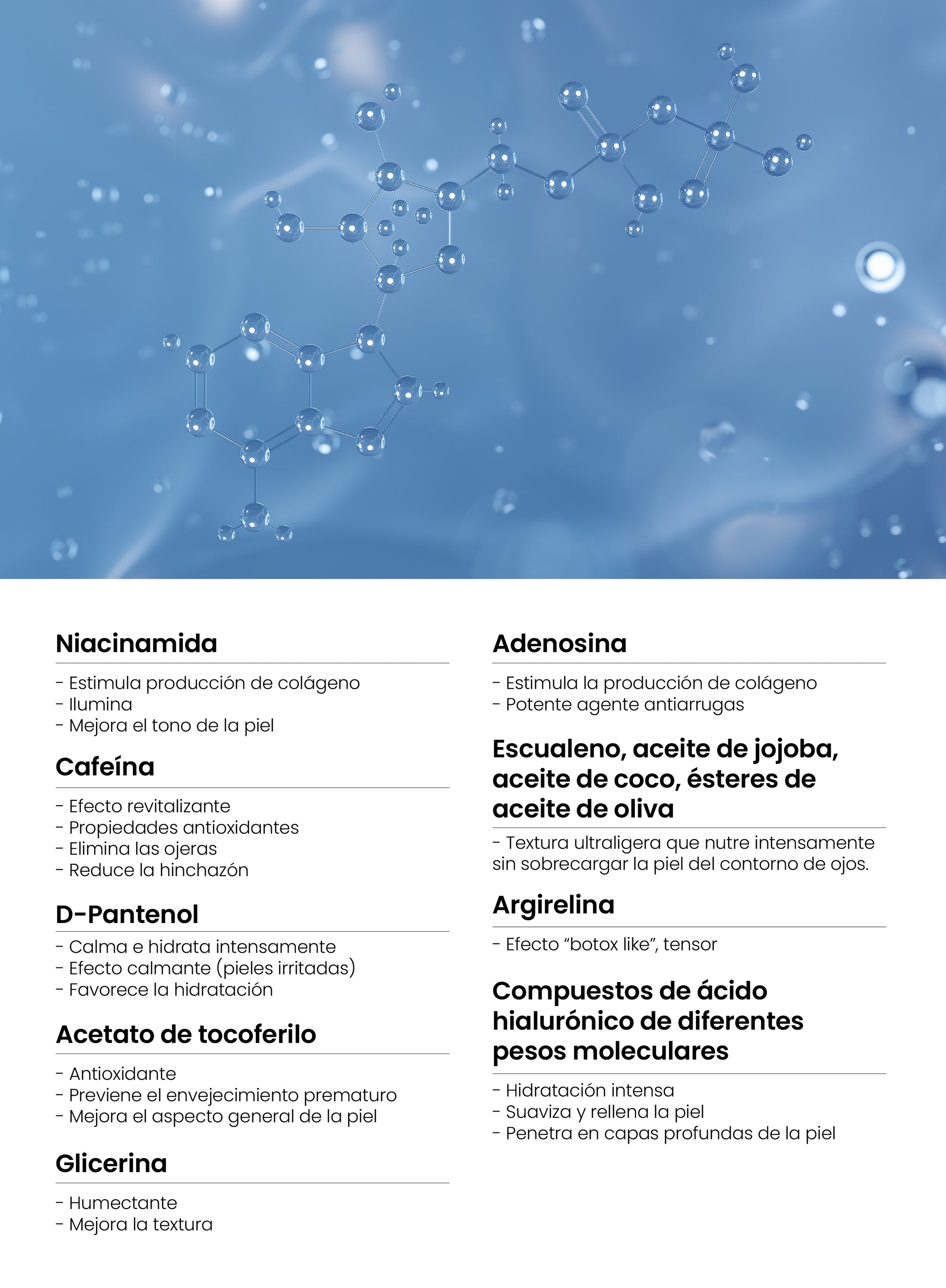 Caffeina - Stimola la microcircolazione, riduce il gonfiore e le ecchimosi, e fornisce un effetto rivitalizzante. La caffeina è caratterizzata dalla sua elevata attività biologica e dalla sua capacità di penetrare la barriera cutanea, oltre alle sue potenti proprietà antiossidanti. Le sue molecole sono sufficientemente piccole da penetrare gli strati superficiali della pelle, il che le permette di agire intradermicamente. Aiuta a proteggere le cellule dai raggi UV e rallenta il fotoininvecchiamento cutaneo. Inoltre, la caffeina aumenta la microcircolazione cutanea agendo come vasocostrittore, riducendo e contraendo i vasi sanguigni, diminuendo il flusso sanguigno e donando un aspetto più luminoso e levigato. La caffeina è un efficace ingrediente rinfrescante che elimina le occhiaie e riduce il gonfiore.